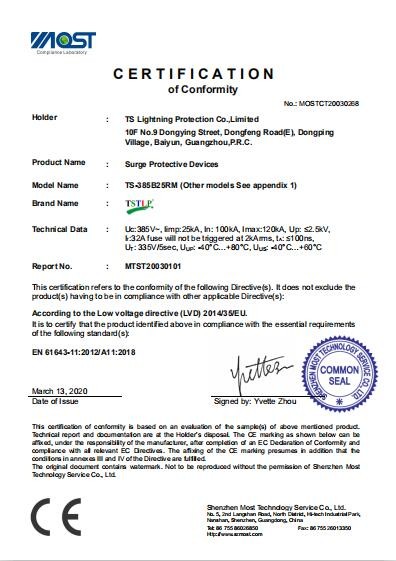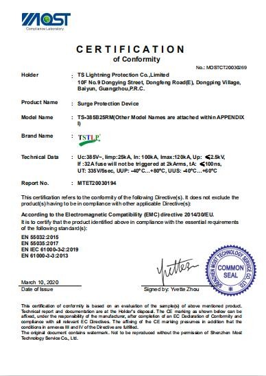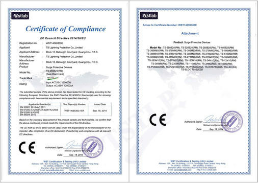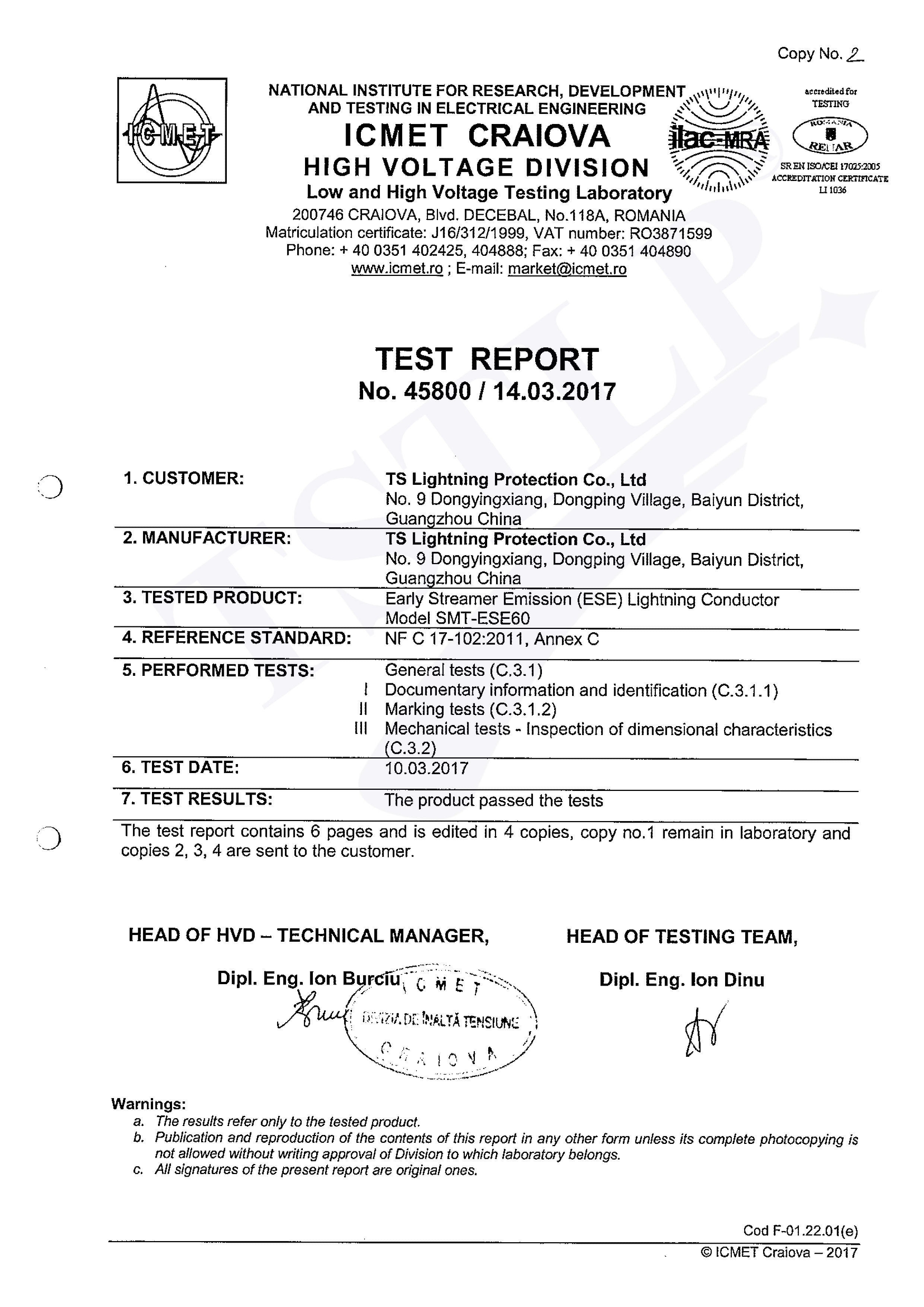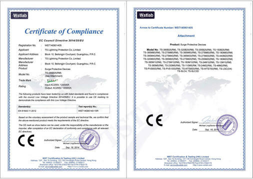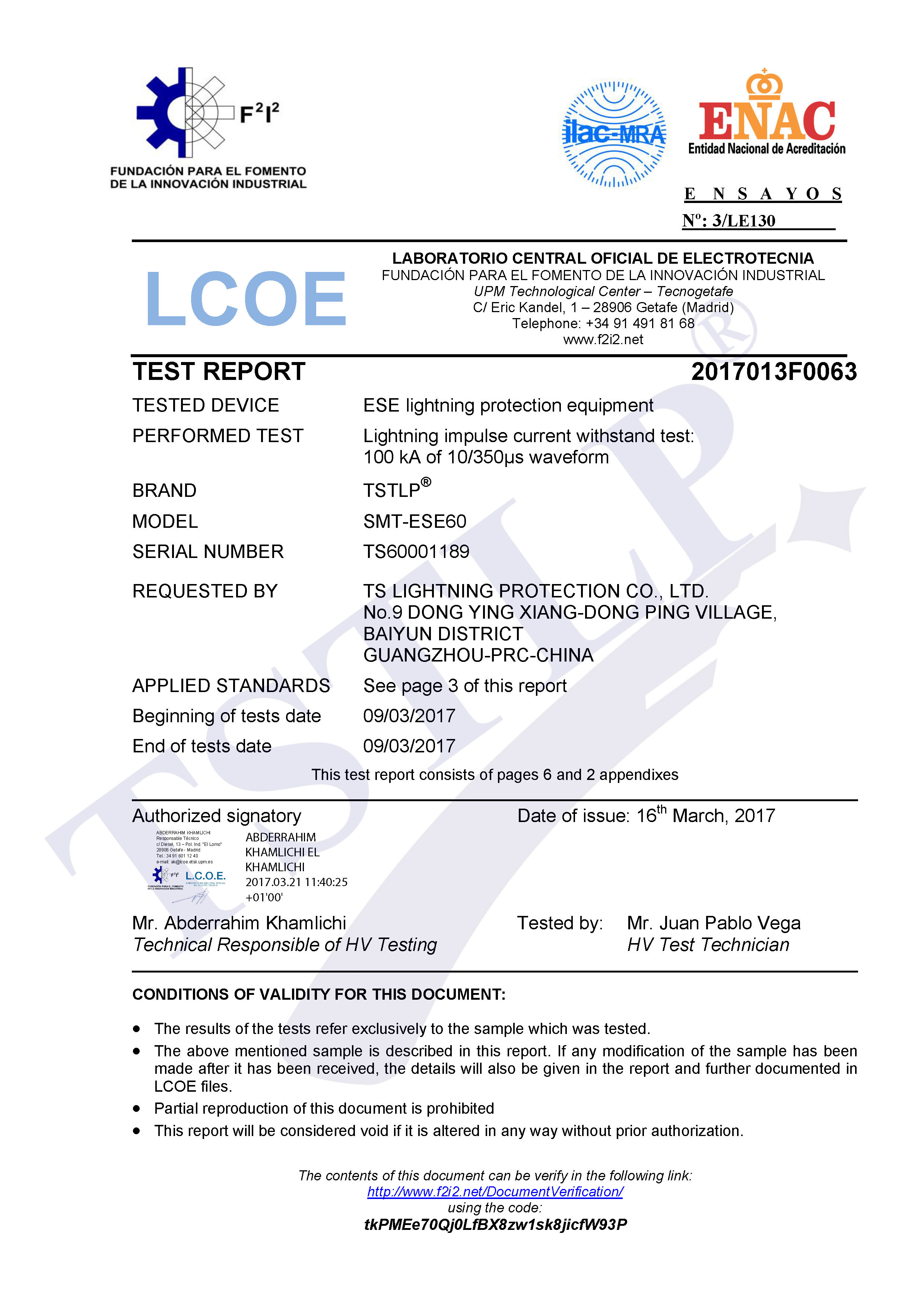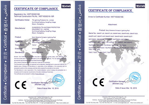 Official Patent Rights, Official Test Reports/Certificates done at accredited labs in Shenzhen, Shanghai, Spain and Romania-Europe are available for most of our own TSTLP lightning protection products. And cover pages of these test reports/certificates are marked separately with CE, CAL, CMA, Romania-RENAR, ENAC & ilac-MRA, among all the marks, ilac-MRA is the most important recognition for international acceptance.