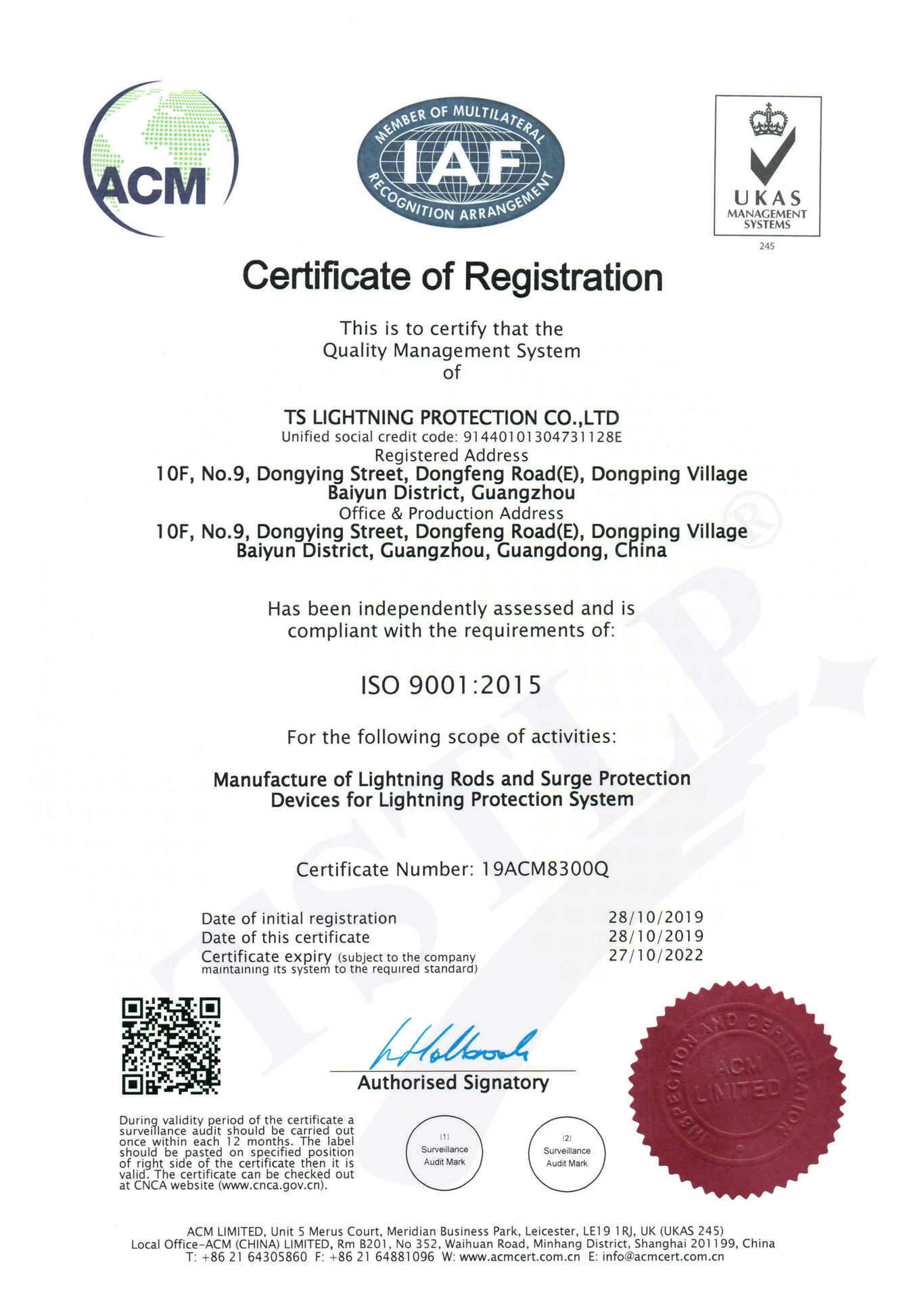 ISO9001:2015 Quality Management System Certificate (Certificate No.19ACM8300Q with IAF, UKAS & ACM marks), we perform strict QC measures/tests to our products by our yearly-calibrated advanced lightning protection equipment testers for times according to the Product Standards & Function from original components to finished products to maximumly satisfy our clients & users. HIGH-Quality is our most important manufacturing pursuit.